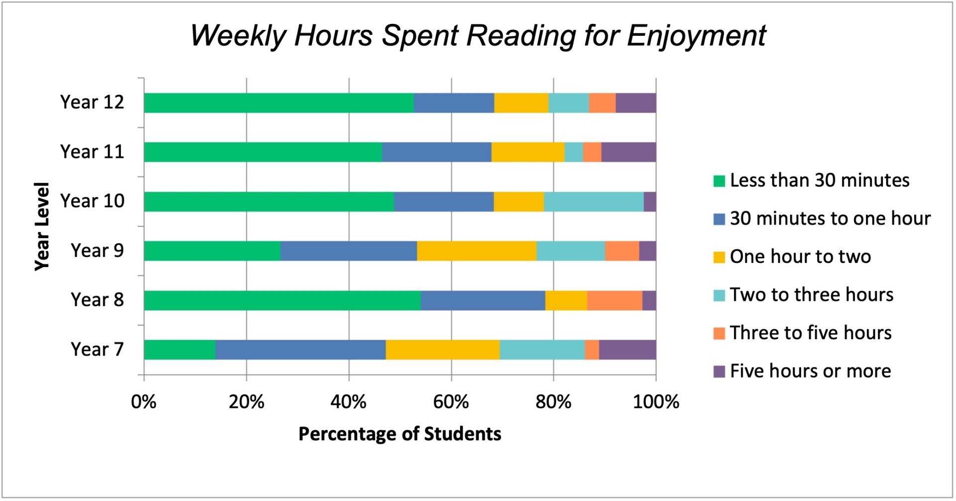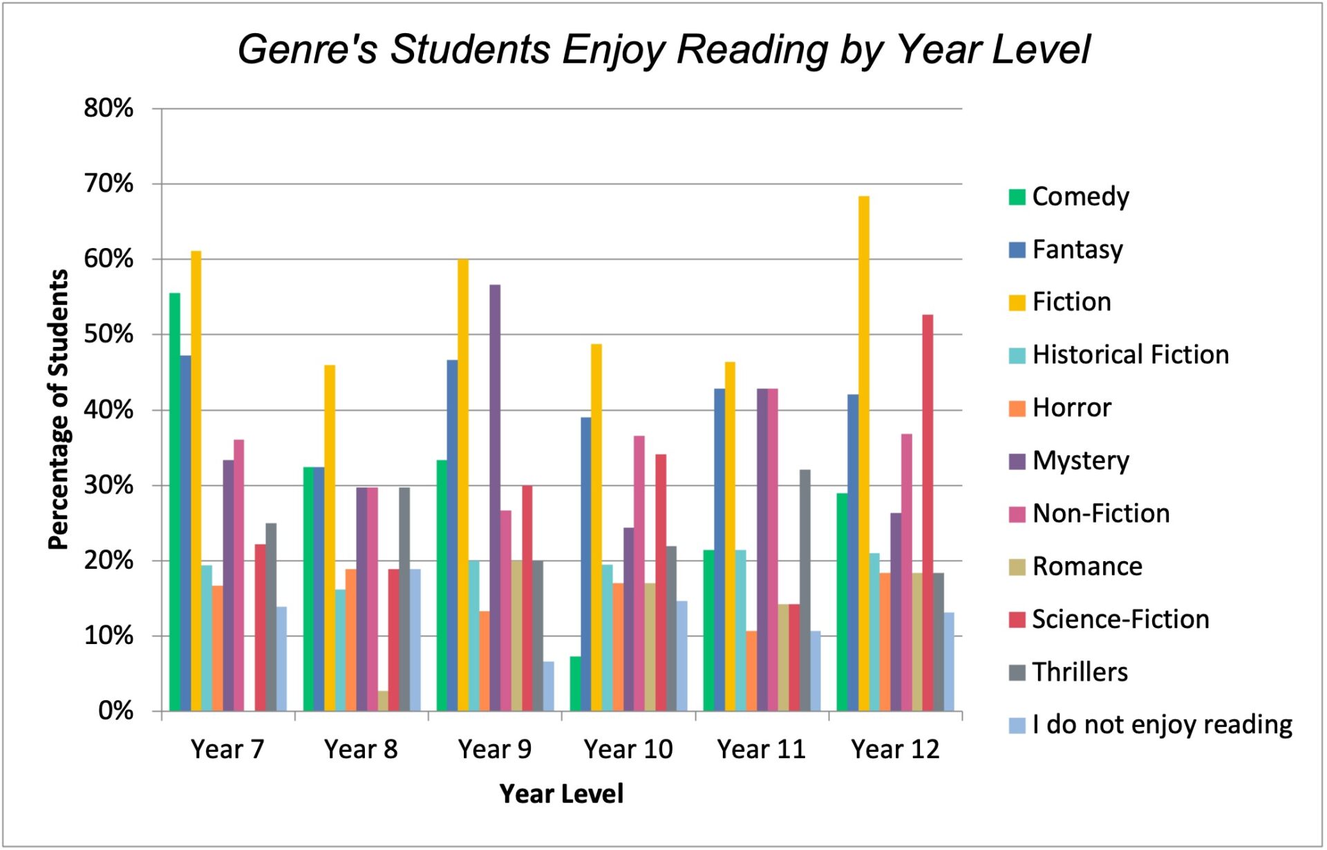 The study yielded useful data about our Senior School student’s reading habits and preferences, which has led to purposeful discussion amongst faculties. Encouragingly, 88.67% of student respondents noted one or more genres which they enjoyed reading, although reading engagement tended to decrease as students aged. 64.28% of students reported that they read for enjoyment for less than one hour a week outside of school, which reminds us of the importance of gently compelling boys into these habits through our wide reading and broader English, literacy and Library programs. These findings demonstrate a need for us to continue to encourage and foster reading in our community. The English and Library teams, for example, will maintain their focus on offering students further reading time and access to their preferred texts.